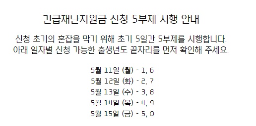 5월 4일부터 정부가 전 국민에게 최대 100만 원까지 코로나19 긴급재난지원금을 지급하기로 했다. 긴급재난지원금은 국민 개개인이 아닌 가구 단위로 받기로 했으며. ‘가구’는 주민등록 세대를 기준으로 잡혀있으며, 건강보험 피부양자 개념을 적용하도록 되어 있다. 지급액으로는 가구당 금액이 다르게 책정되어 있으며, 1인 가구 40만 원, 2인 가구 60만 원, 3인 가구 80만 원, 4인 가구 100만 원으로 책정되었다.
