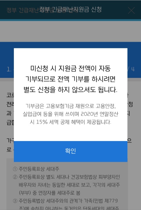 ② '지원금 신청' 버튼 클릭하여 본인인증 후 긴급재난지원금 및 기부(선택사항, 일부금액도 가능) 신청