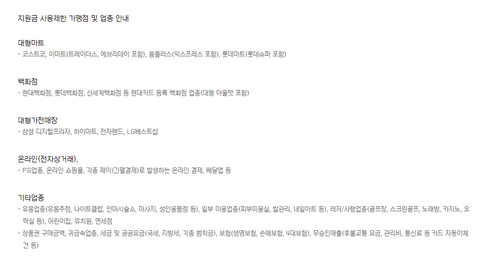 카드사를 통해 지급받은 금액은 발급받은 주소지 관할 특·광역시·도(광역자치단체)에서만 사용 가능하며, 기간(~08.31) 및 사용 가능한 업종이 제한됨