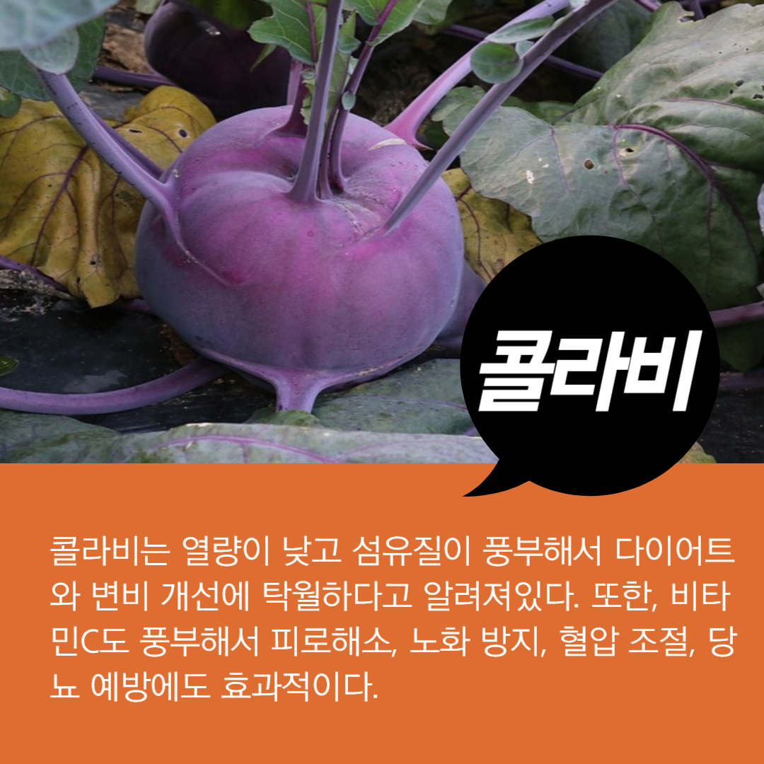 콜라비는 열량이 낮고 섬유질이 풍부해서 다이어트와 변비 개선에 탁월하다고 알려져있다. 또한, 비타민C도 풍부해서 피로해소, 노화 방지, 혈압 조절, 당뇨 예방에도 효과적이다.